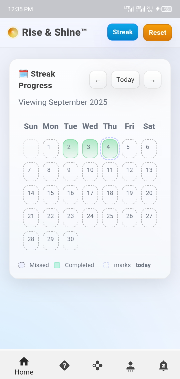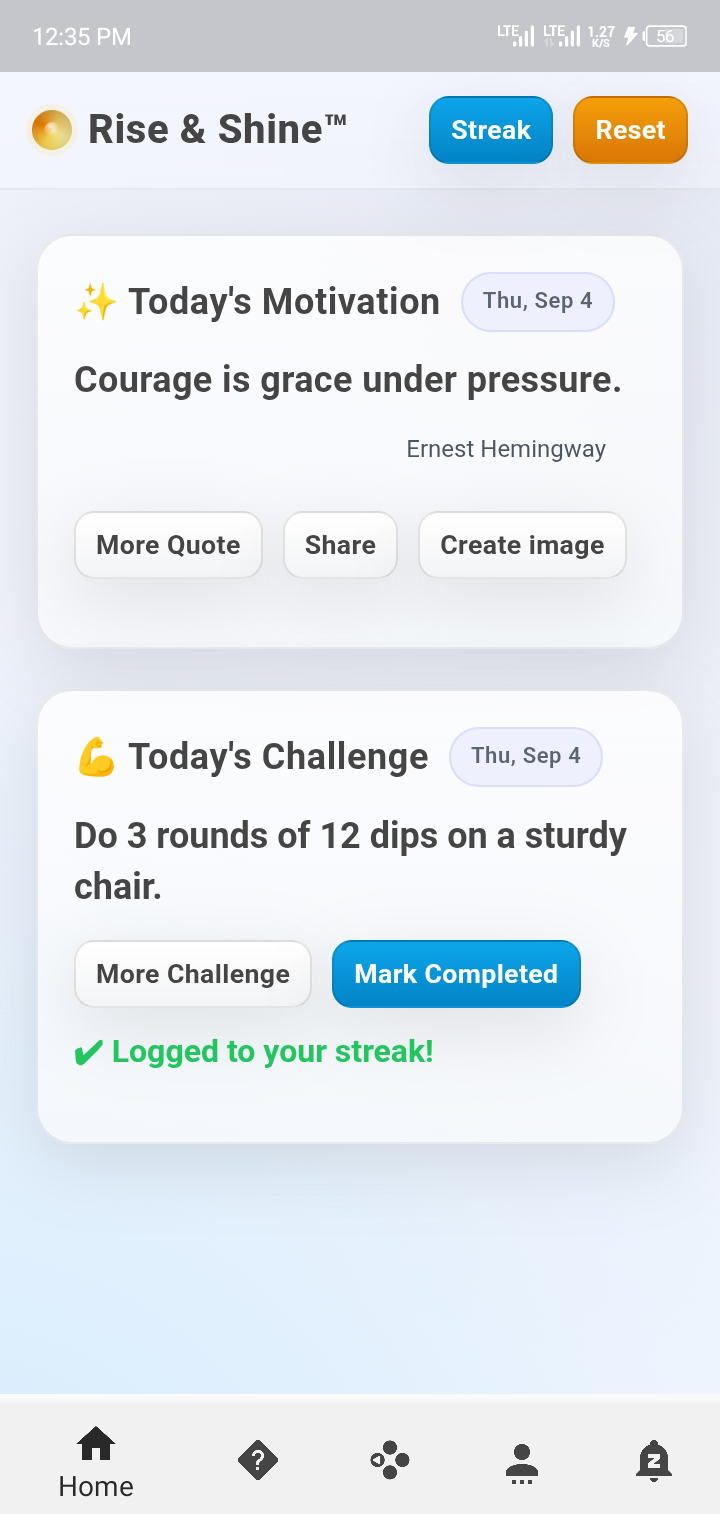 Rise & Shine is a daily motivation and habit-building app that provides inspiring quotes, exercise challenges, and streak tracking to help users stay consistent with their goals and start their day positively.